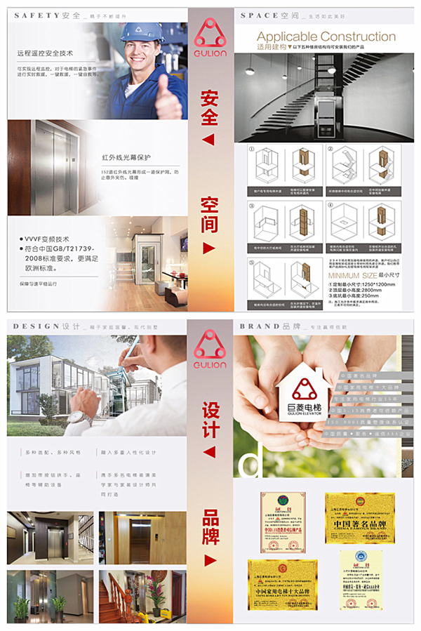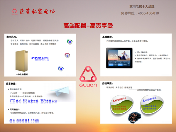 巨菱Gulion安全私家電梯在家用電梯、別墅電梯、座椅電梯、躍層電梯、樓道電梯等私家電梯細分領域因?qū)W⒍劽?,特別是在私人高端電梯定制及處理私家豪宅,聯(lián)排別墅,躍層別墅,復式結構等設計難題和復雜技術難度等電梯解決方案上表現(xiàn)卓著。致力于為不同客戶提供出高端、安全及建筑裝飾風格匹配的家用電梯、別墅電梯、座椅電梯及各種樓梯輔助解決方案。