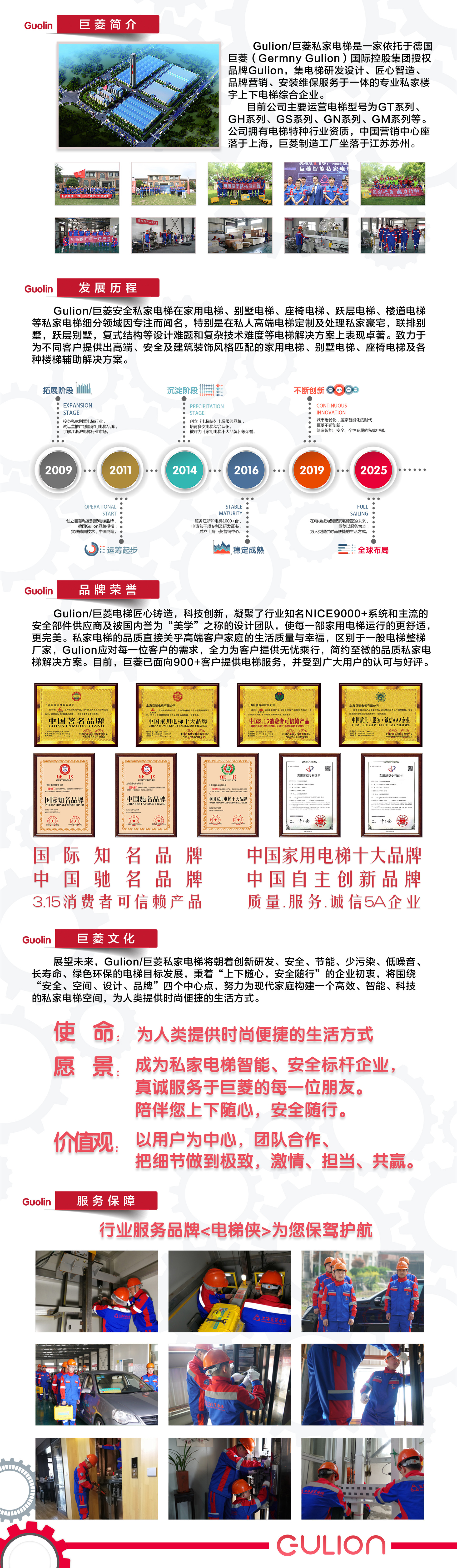 Gulion巨菱私家電梯是一家依托于德國巨菱(GERMANY GULION)國際控股集團(tuán)德國授權(quán)品牌GULION,集電梯研發(fā)設(shè)計、匠心智造、品牌營銷、安裝維保服務(wù)于一體的專業(yè)私家樓宇上下電梯綜合企業(yè)。目前公司主要運(yùn)營電梯型號為GT系列、GH系列、GS系列、GN系列、GM系列等。公司擁有電梯特種行業(yè)資質(zhì),中國營銷中心座落于上海,毗鄰于上海大虹橋版塊。