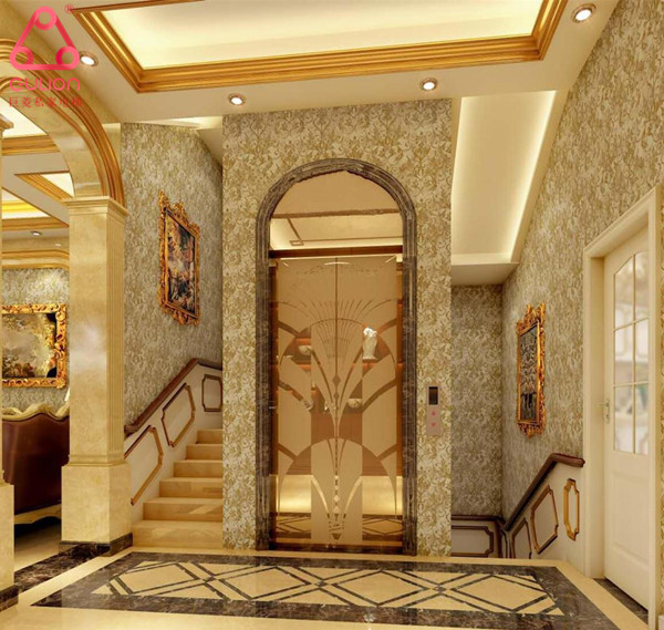 依據(jù)陸總家整體歐式宮廷式家裝風格,我們家用電梯選定金色蝕刻廳門;內(nèi)部裝潢吊頂選擇鈦金鏡面蝕刻,LED宮廷風裝飾筒燈;轎壁選擇大理石紋鋁塑板,鏡面不銹鋼蝕刻,PVC邊線裝飾。電梯整體視覺感很震撼!奢華、尊貴、高端的氣質(zhì)跟家裝風格相得益彰。成品安裝效果圖如下: