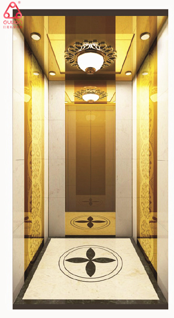 依據(jù)陸總家整體歐式宮廷式家裝風格,我們別墅電梯選定金色蝕刻廳門;內(nèi)部裝潢吊頂選擇鈦金鏡面蝕刻,LED宮廷風裝飾筒燈;轎壁選擇大理石紋鋁塑板,鏡面不銹鋼蝕刻,PVC邊線裝飾。電梯整體視覺感很震撼!奢華、尊貴、高端的氣質(zhì)跟家裝風格相得益彰。成品安裝效果圖如下: