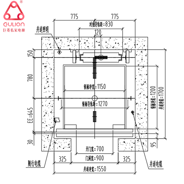 電梯轎廂內(nèi)部尺寸:1150*1200*2200mm(寬*深*高)